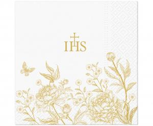 Eleganckie Serwetki Komunijne Złote IHS i Kwiaty 33x33cm (20 szt.)