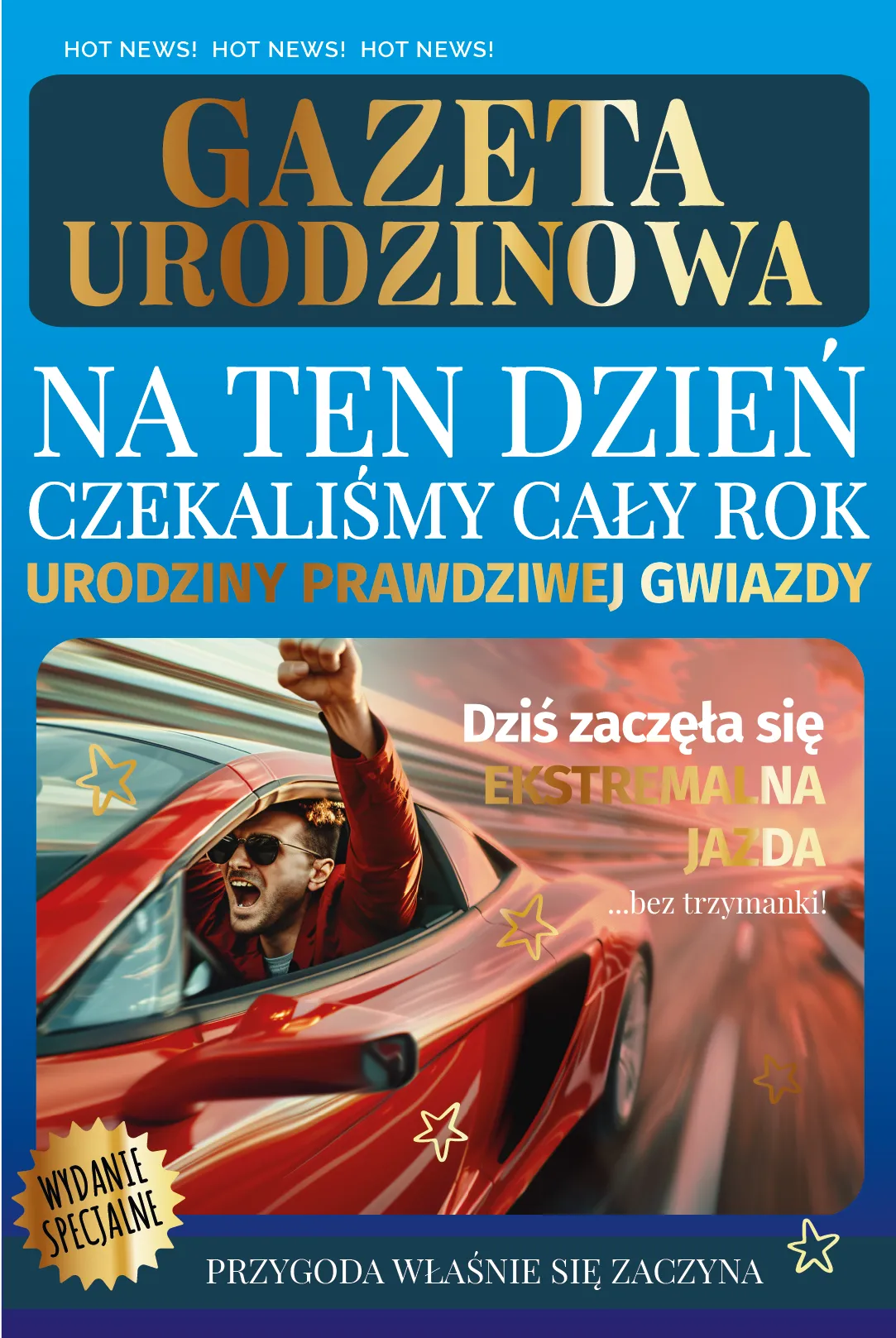 Szukasz kartki, która wyróżni się na tle innych? Nasz **KARNET OKOLICZNOŚCIOWY Z SERII AS** w formie **"Gazety Urodzinowej"** to strzał w dziesiątkę dla każdego fana motoryzacji i szybkiego życia. Okładka przedstawia dynamiczne ujęcie sportowego samochodu z nagłówkiem o "ekstremalnej jeździe". Złocenia dodają kartce elegancji i sprawiają, że wygląda jak ekskluzywne wydanie specjalne.