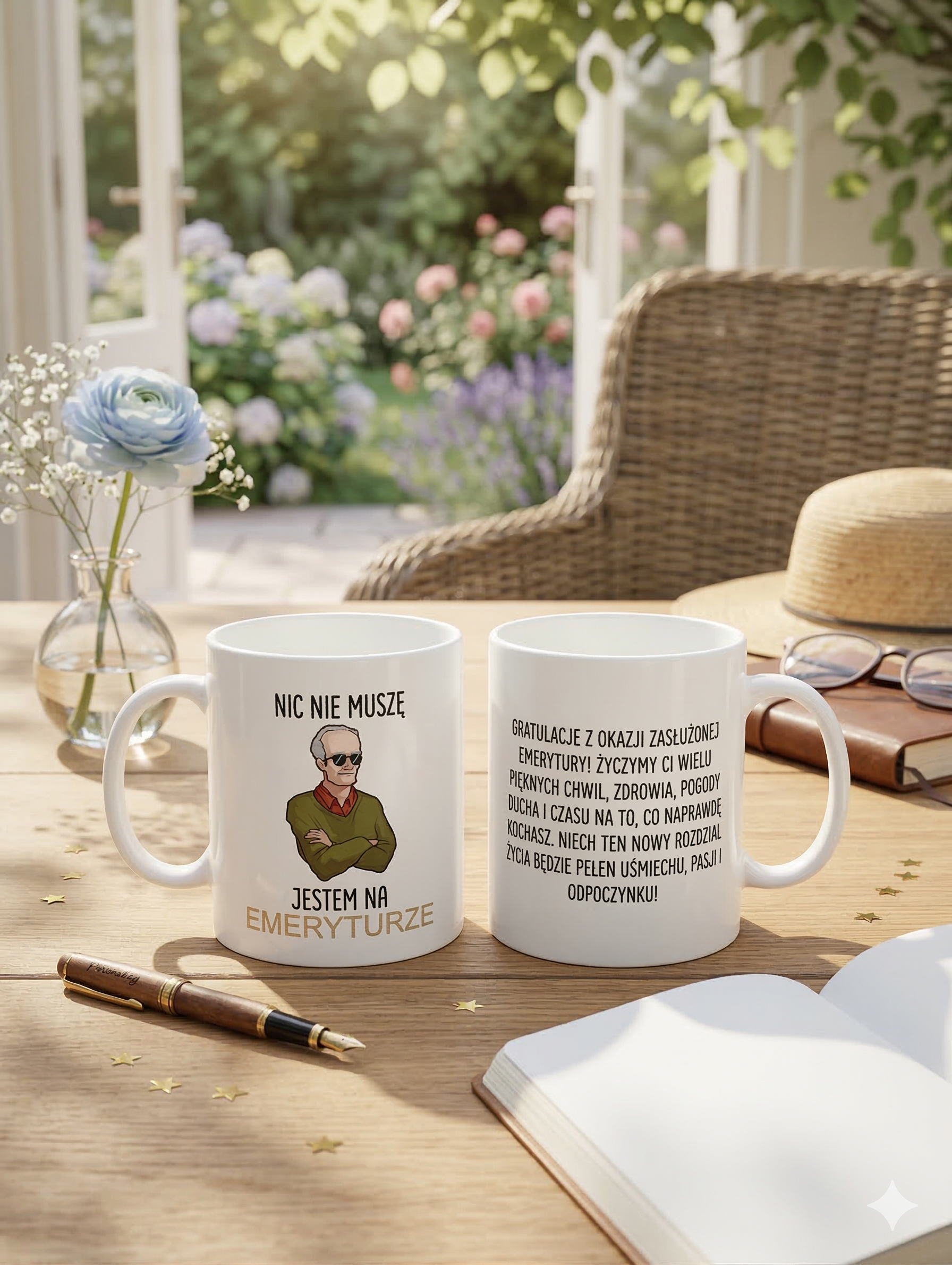 - Wzruszający tekst: Na odwrocie kubka umieściliśmy piękne, gotowe życzenia: "Gratulacje z okazji zasłużonej emerytury! Życzymy Ci wielu pięknych chwil, zdrowia, pogody ducha i czasu na to, co naprawdę kochasz...".