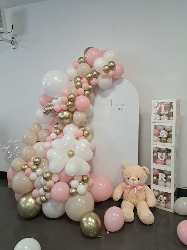 Pierwsze urodziny lub Chrzest Święty to chwile, do których cała rodzina będzie wracać we wspomnieniach przez lata. Nasza aranżacja na białym łuku MDF z uroczo siedzącym misiem została zaprojektowana po to, aby te wspomnienia miały najpiękniejsze możliwe tło. Miękkie, pastelowe barwy, bogata struktura asymetrycznej girlandy i urocze detale sprawiają, że całość prezentuje się niezwykle lekko, słodko i elegancko zarazem.