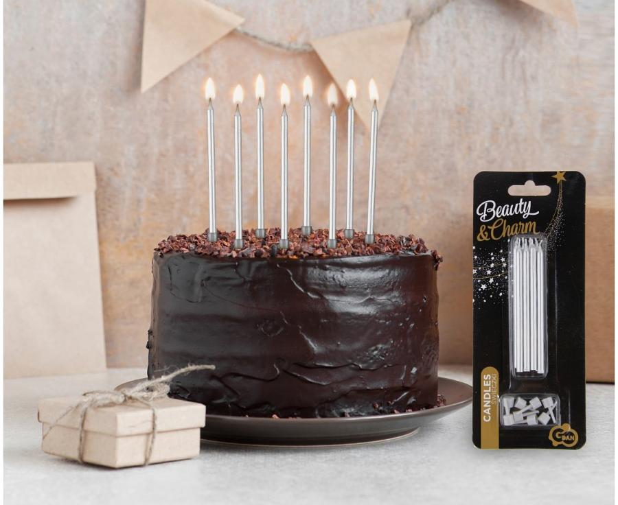 Srebrne Świeczki Urodzinowe z Podstawkami – Elegancki Akcent na Tort od Zabawne Wydry!